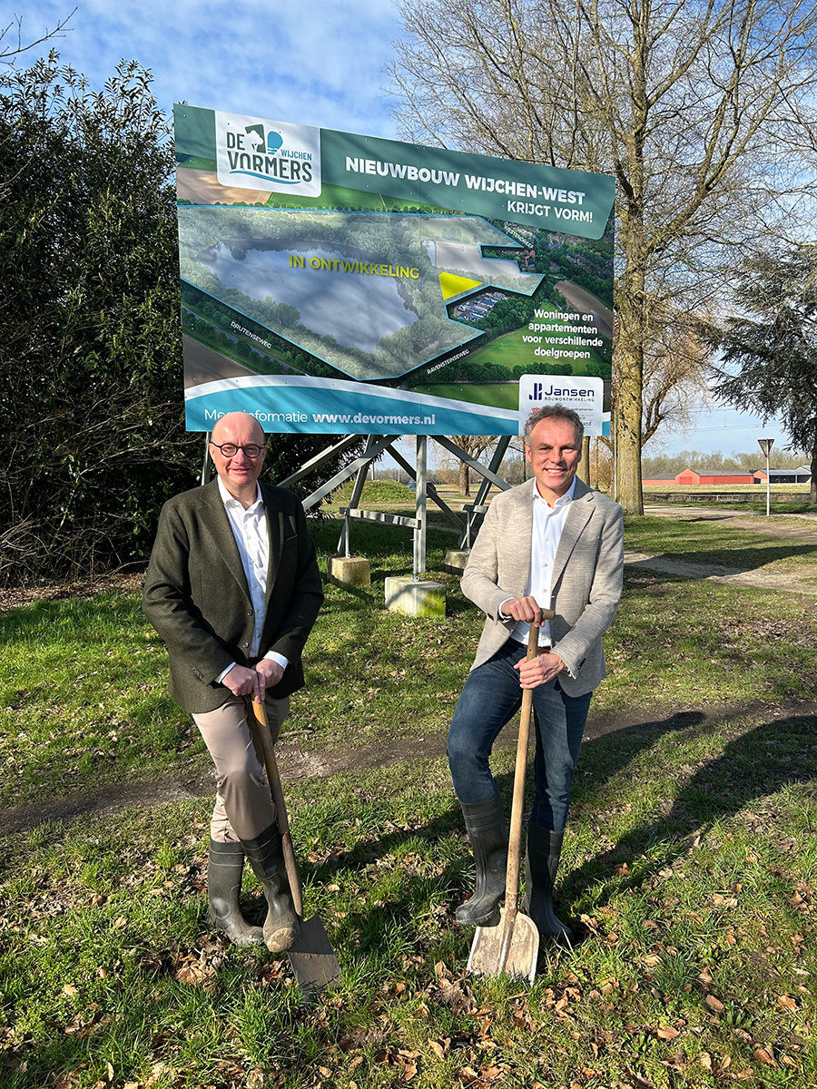 Het bestemmingsplan van Nieuwbouw Wijchen-West is onherroepelijk en er mag dus gebouwd worden. De uitwerking van de eerste woningen en appartementen is in volle gang. Wethouder Geert Gerrits en Jeroen Jeukens, directeur van Jansen Bouwontwikkeling, kijken uit naar de verkoop van de eerste fase van De Vormers die naar verwachting medio 2026 start.